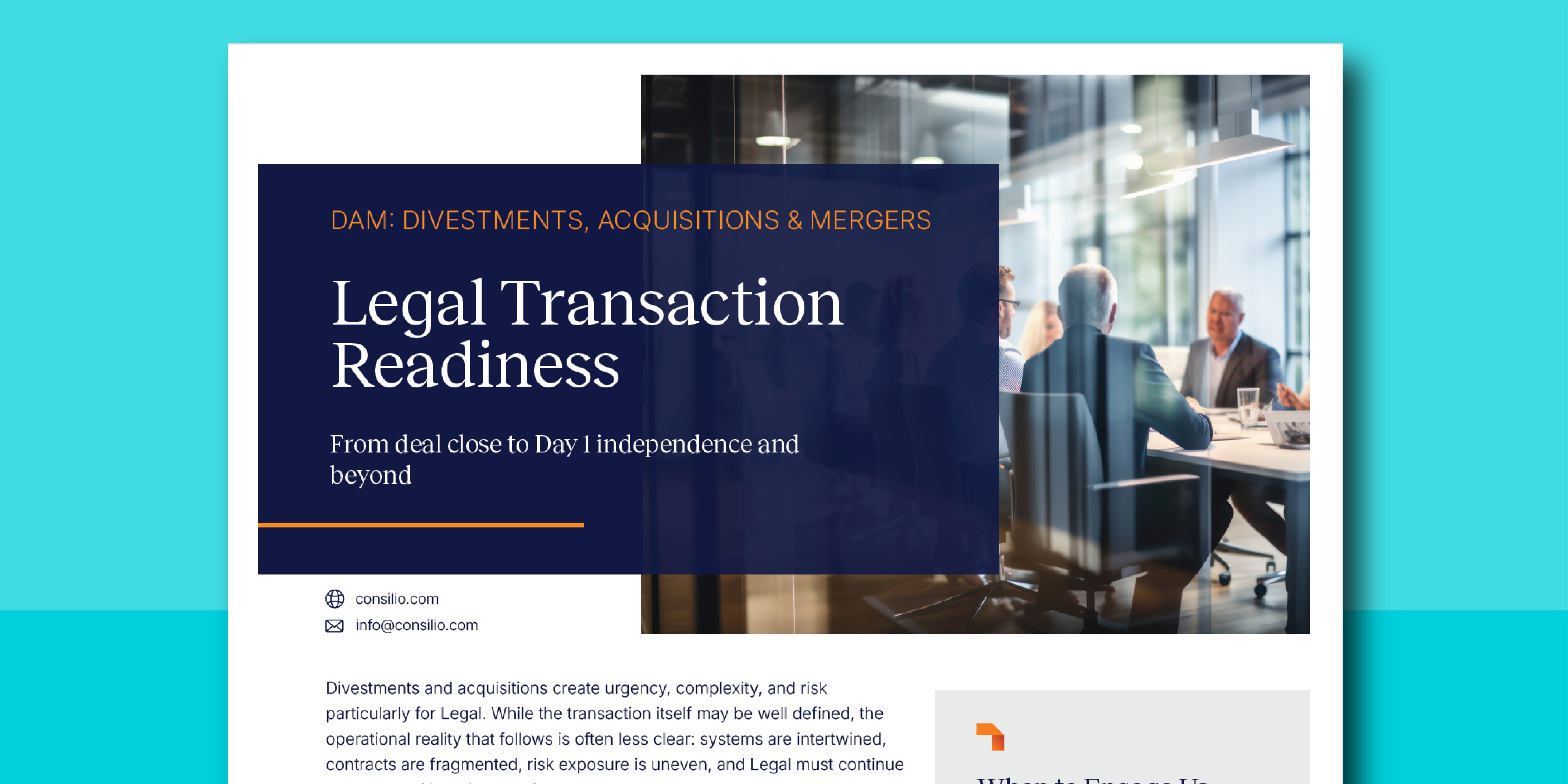 From deal close to Day 1 independence and beyond, Legal Transaction Readiness helps legal teams navigate divestments, acquisitions, and mergers with confidence. By aligning people, process, technology, spend, and AI-enabled contract intelligence, the solution ensures Legal remains operational from Day 0, independent by Day 1, and positioned to scale without disrupting the business.